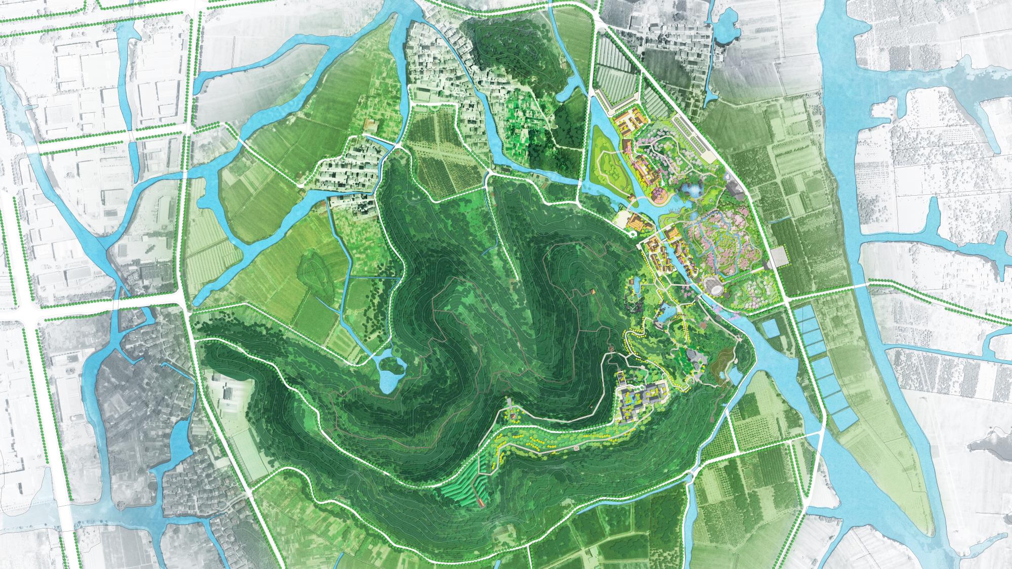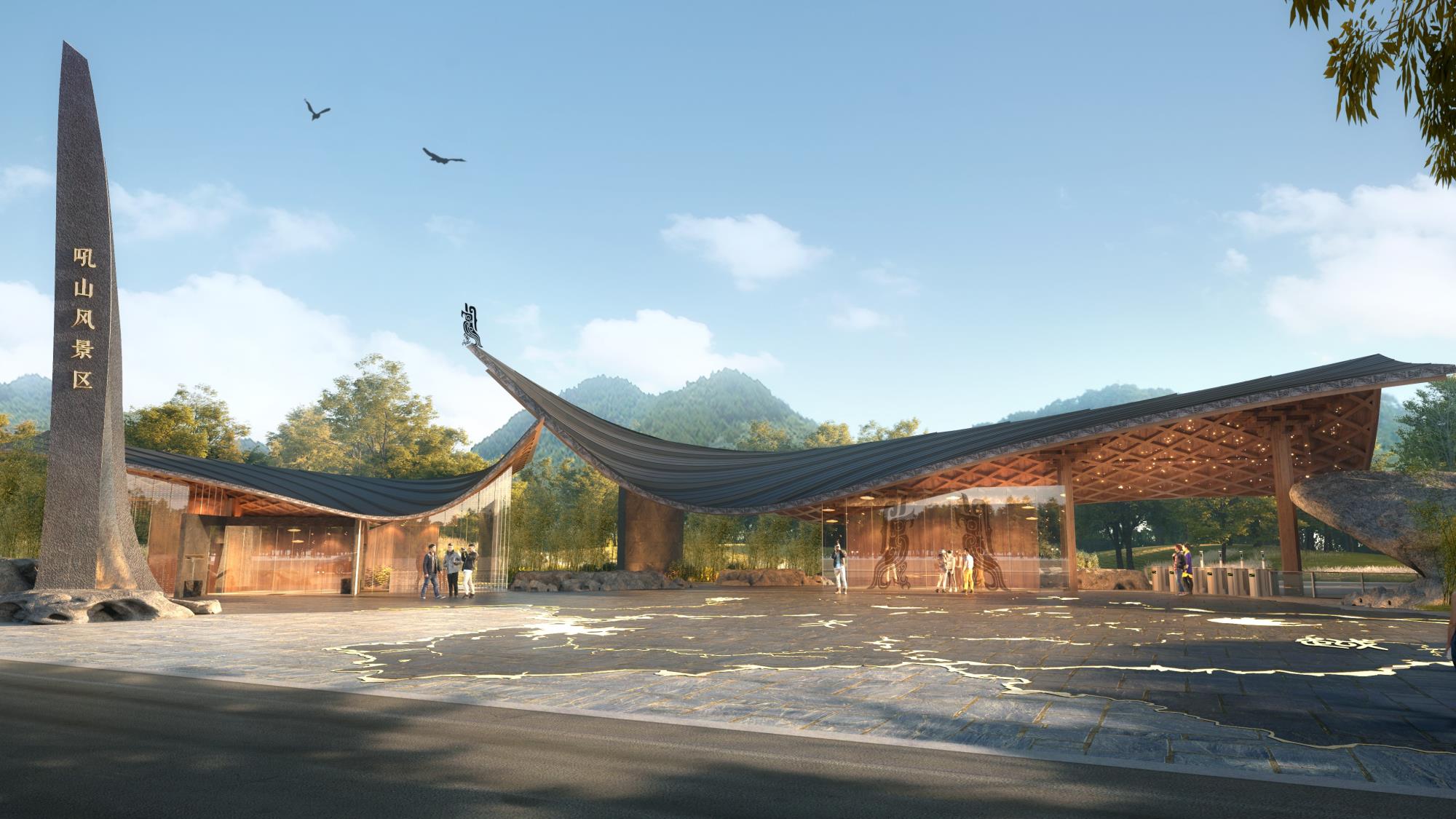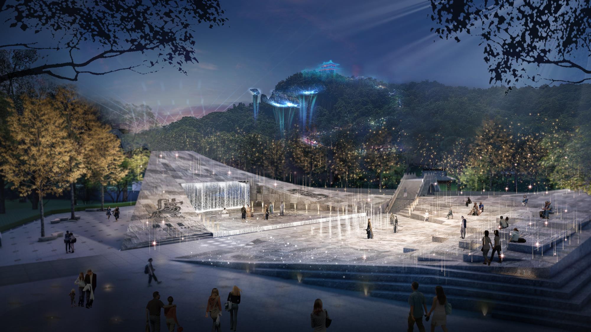 以本地块、吼山景区、东鉴湖作为由小到大、层层递进的局部与整体组织关系进行层级管控设计;以场地生态资源为基底,深挖在地特色文化基因提炼核心故事,打造生态友好型活态文旅体验;基于对文化底色“古越胆剑精神”所代表的元素提炼,以建筑景观氛围一体化进行设计共建进行文化传承;以原场地生态资源为依托,提升效果氛围,结合局部空间的体验打造,形成契合当下游客市场的场景化产品体验。