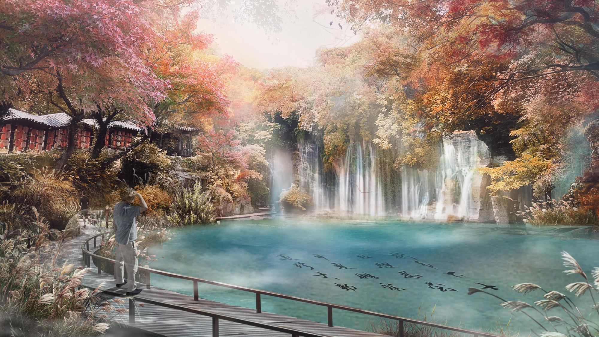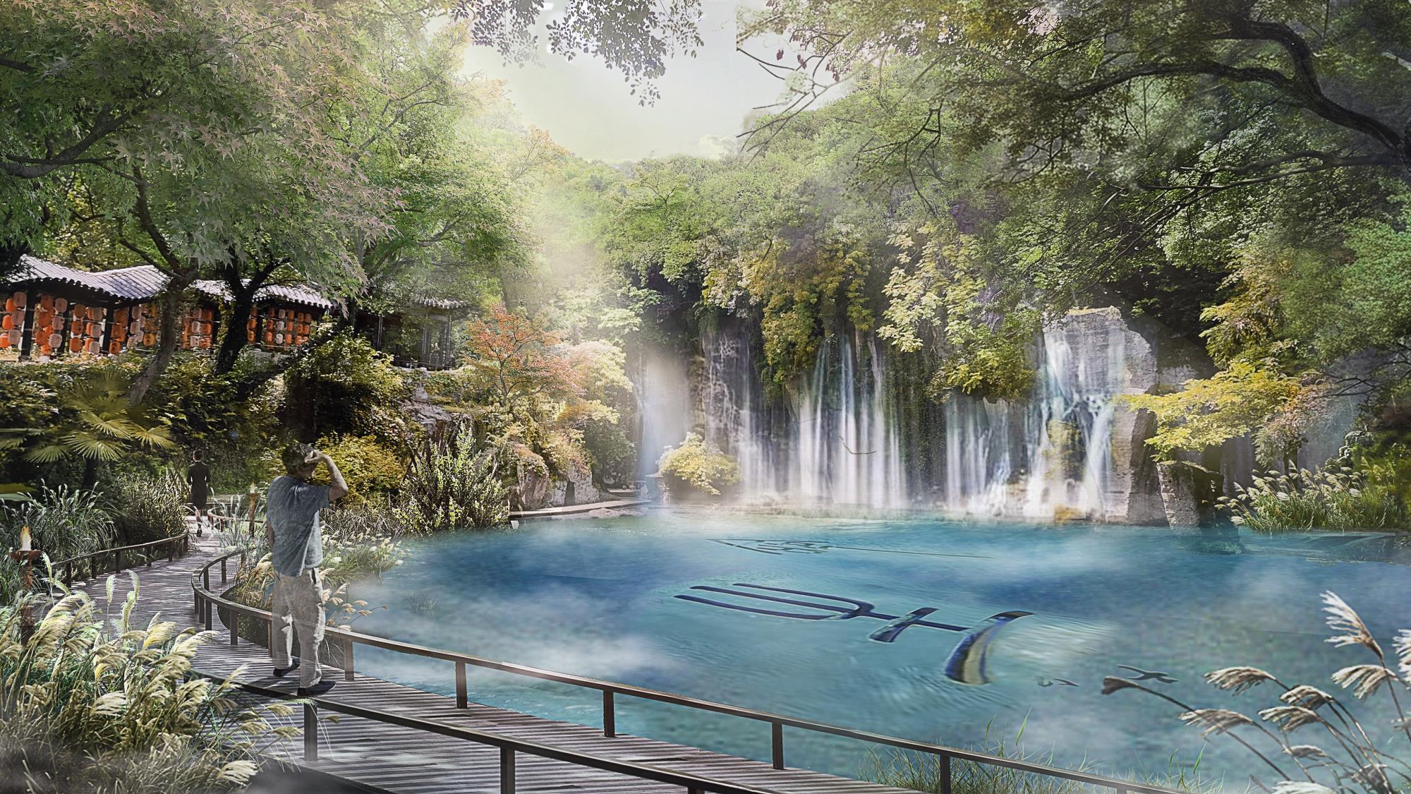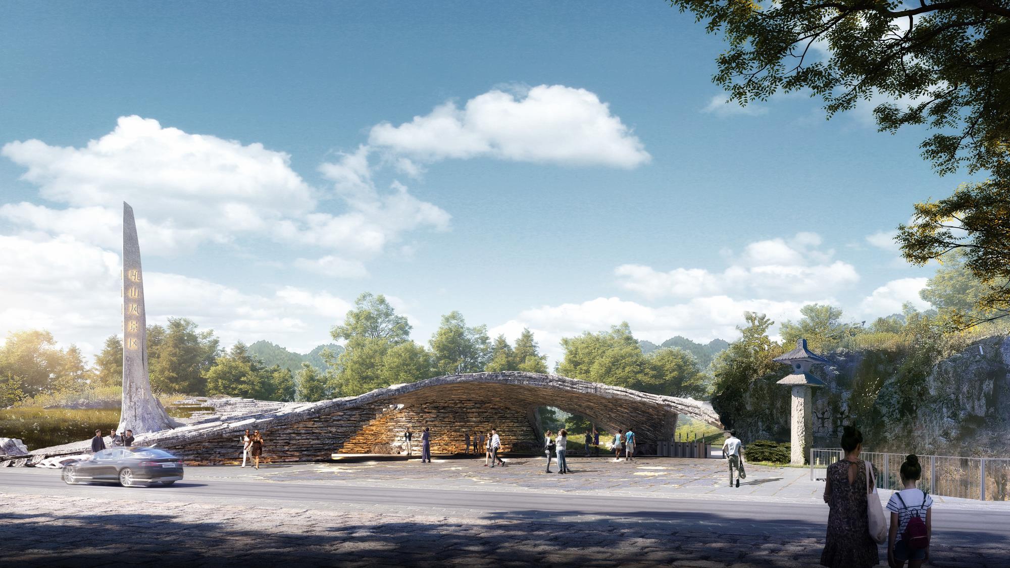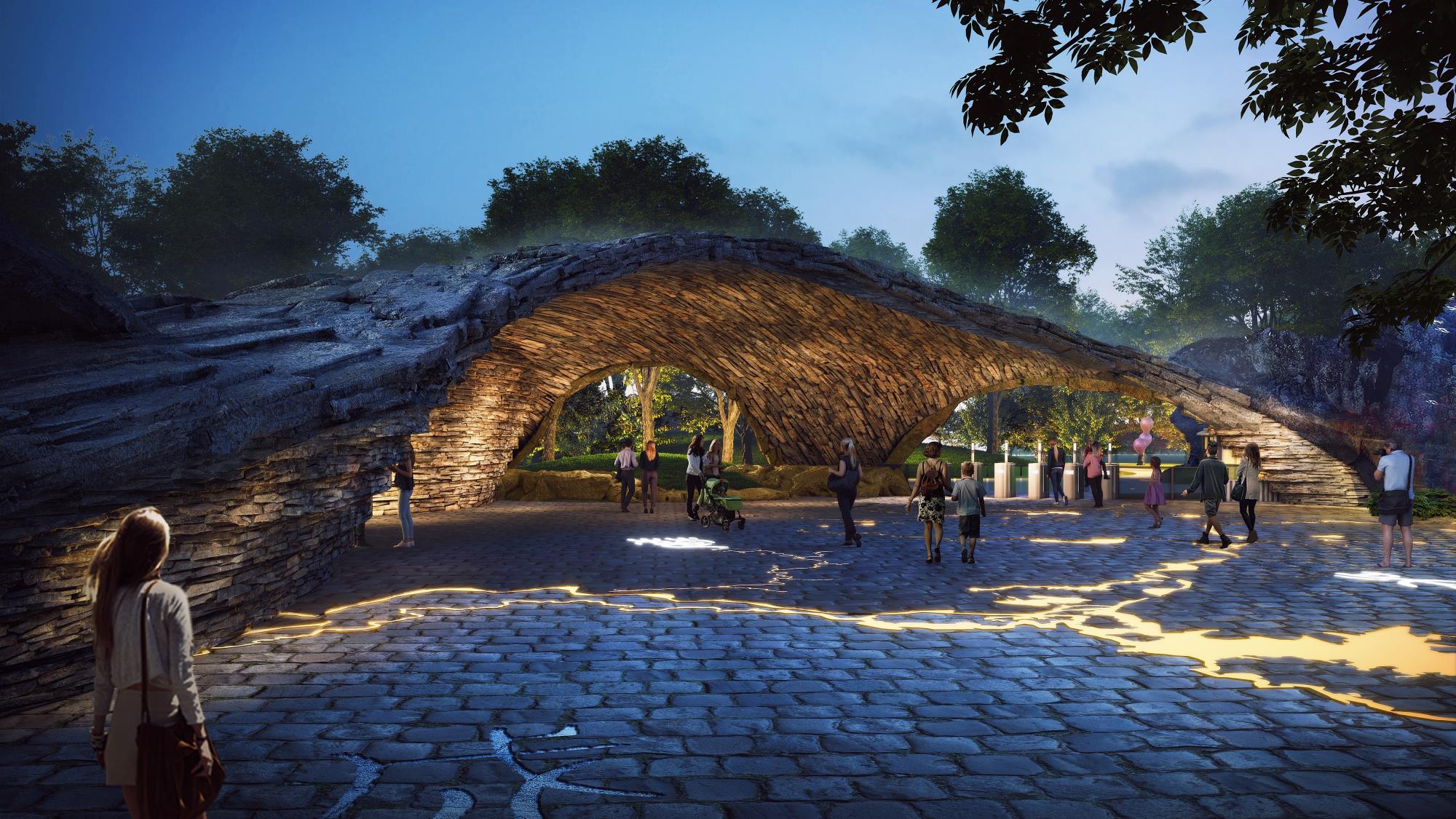 以本地块、吼山景区、东鉴湖作为由小到大、层层递进的局部与整体组织关系进行层级管控设计;以场地生态资源为基底,深挖在地特色文化基因提炼核心故事,打造生态友好型活态文旅体验;基于对文化底色“古越胆剑精神”所代表的元素提炼,以建筑景观氛围一体化进行设计共建进行文化传承;以原场地生态资源为依托,提升效果氛围,结合局部空间的体验打造,形成契合当下游客市场的场景化产品体验。