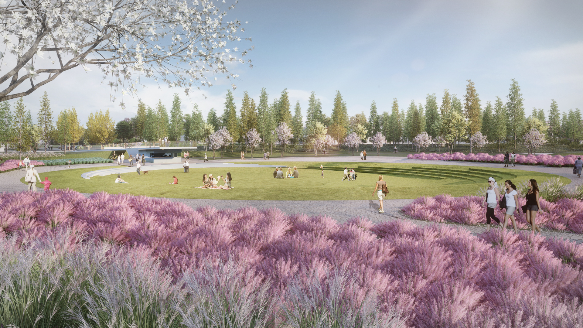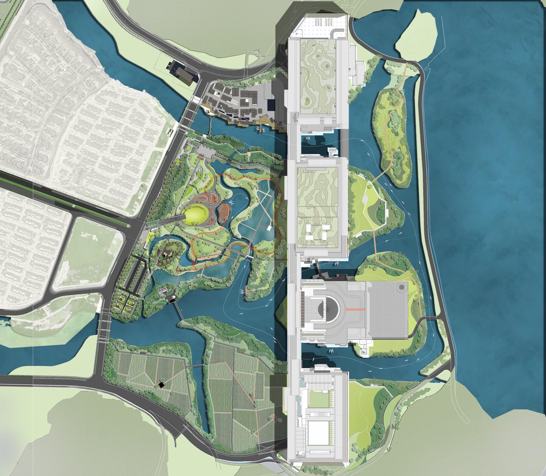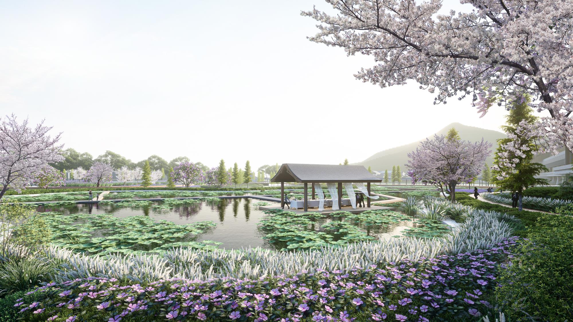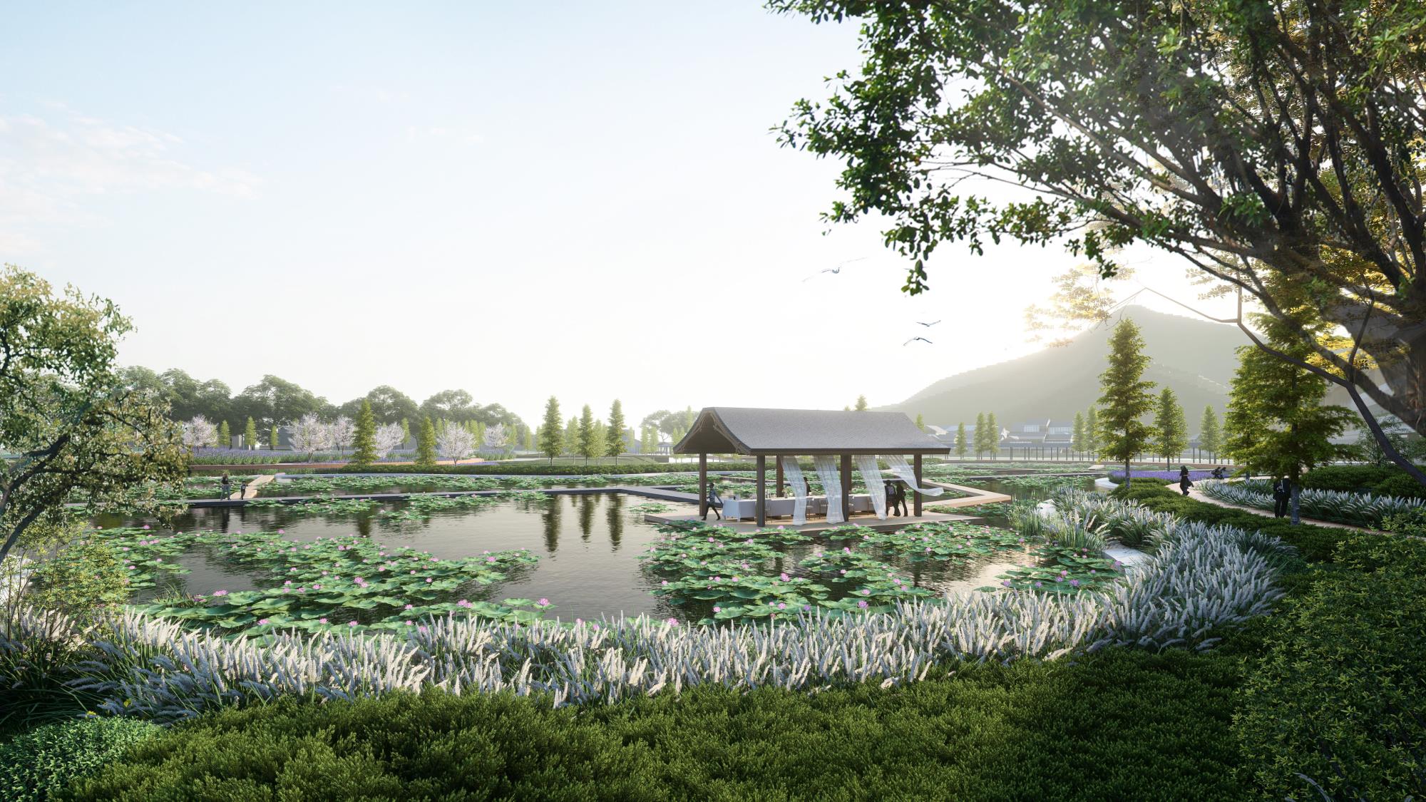 坐落在东钱湖西岸两座山麓之间,从千亩良田湿地到巨型国际会议中心