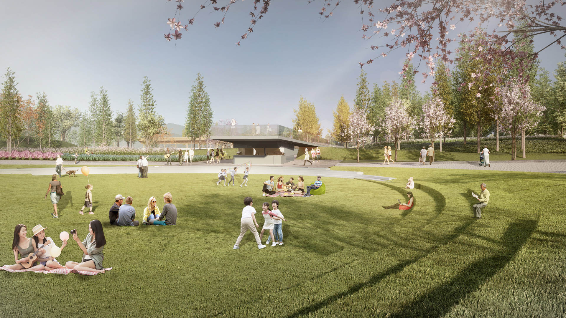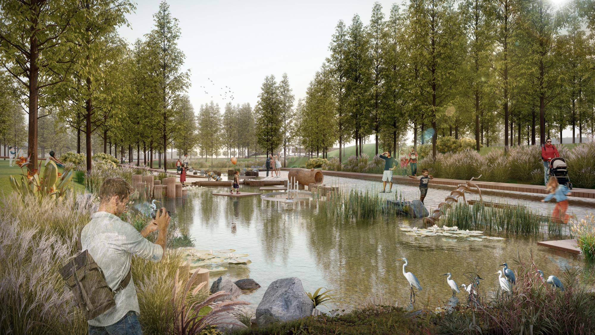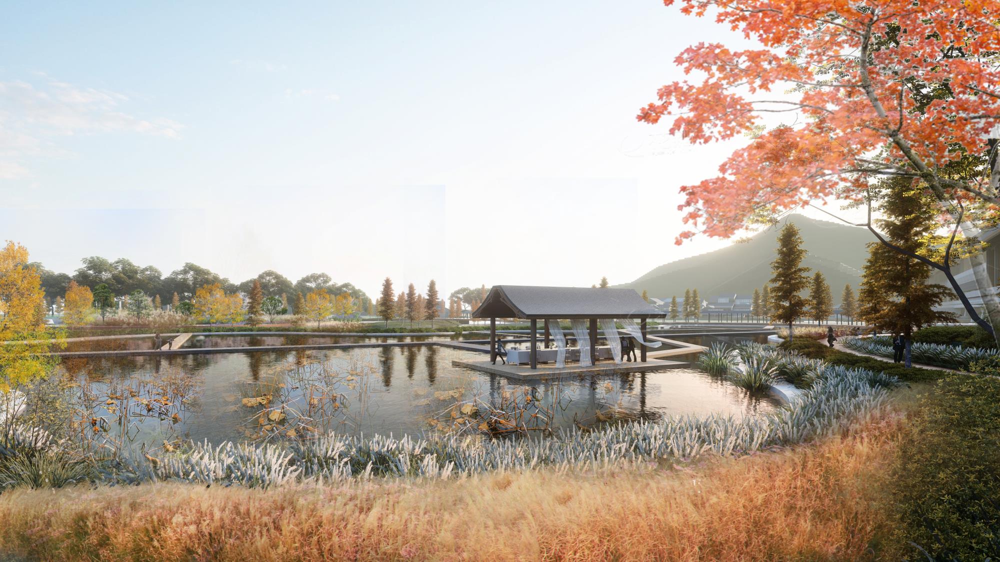 项目建筑整体设计充分利用湖景、山景、河景和周围的景观环境,通过架廊桥,呈现出一幅“连青山,观绿水,望田野”山水城田相依共生的诗意画卷。