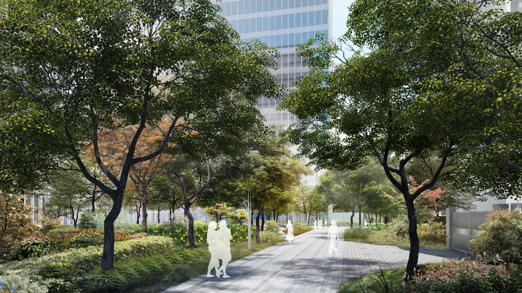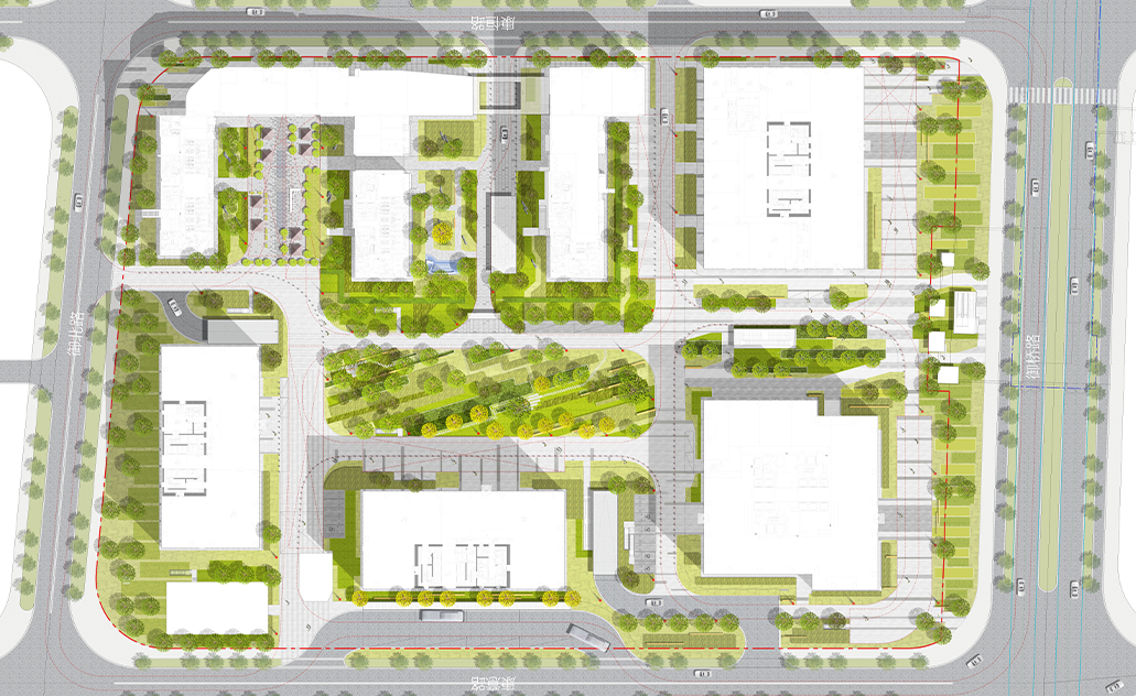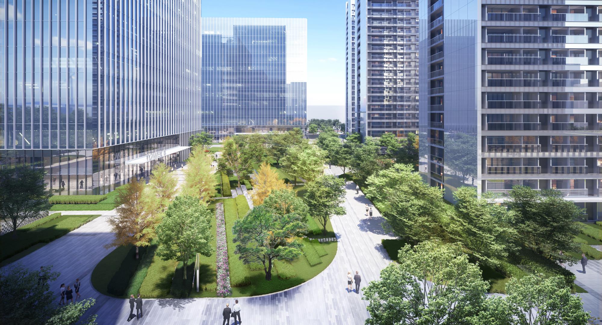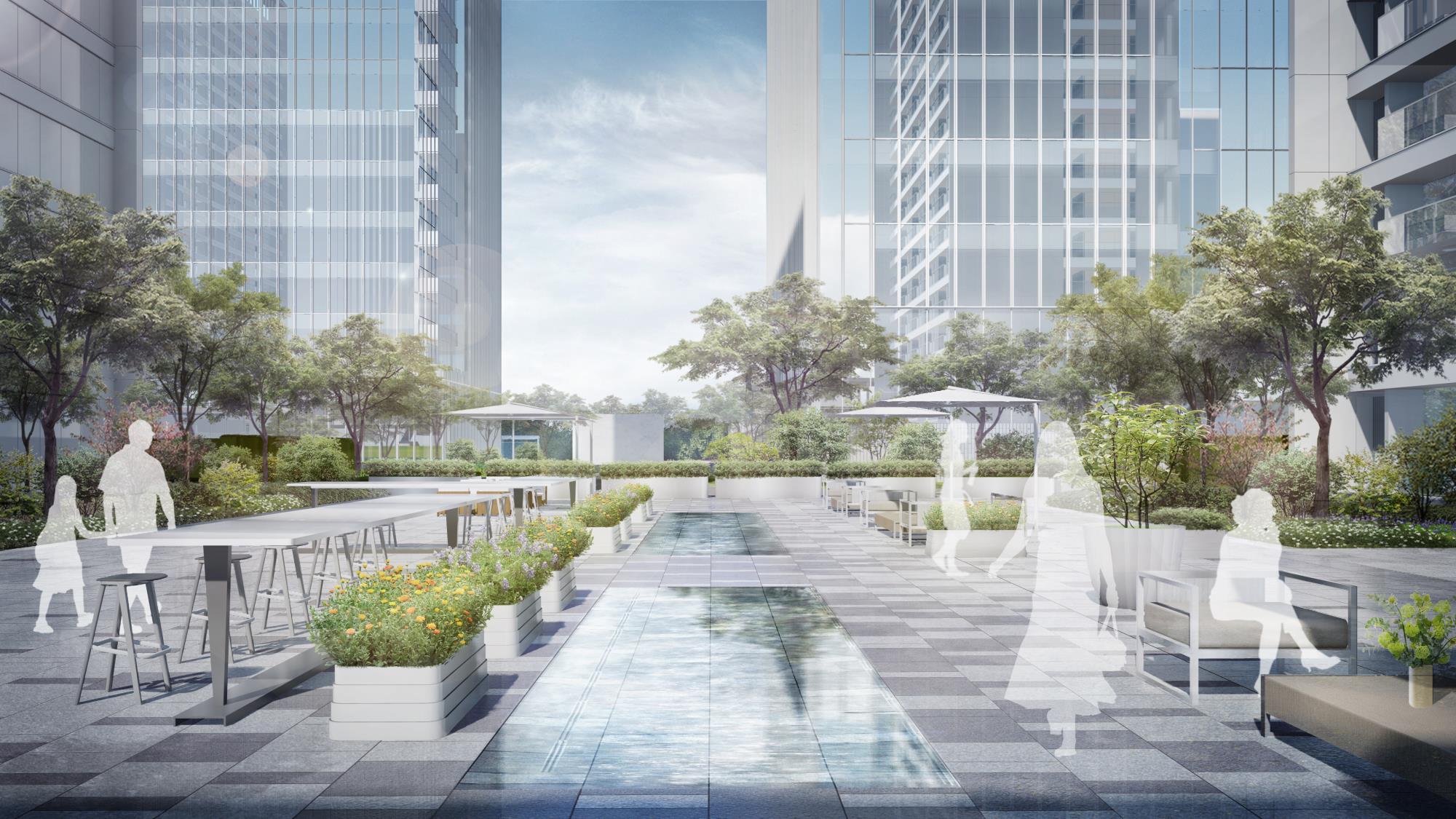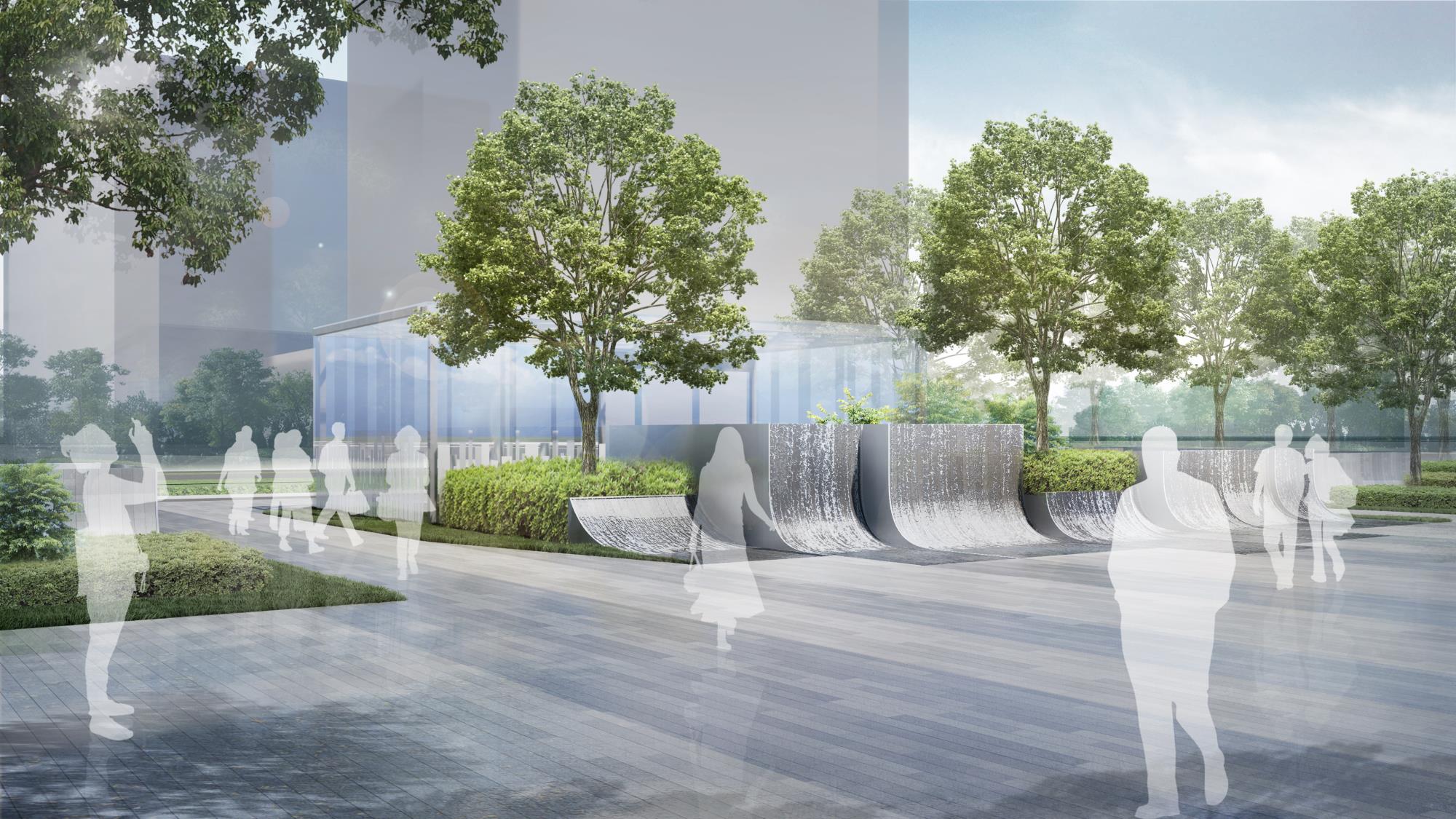 营造时间、空间皆有变化的绿化环境,以生态自然为轴,将办公、商业、住宅相联系。以绿地为轴,将办公与住宅两种不同植栽场景进行渐变式衔接,来营造更好的舒服感与过渡感。