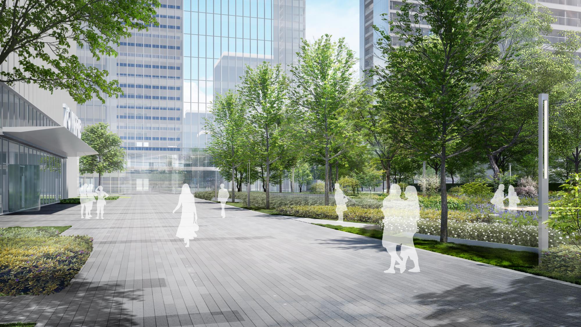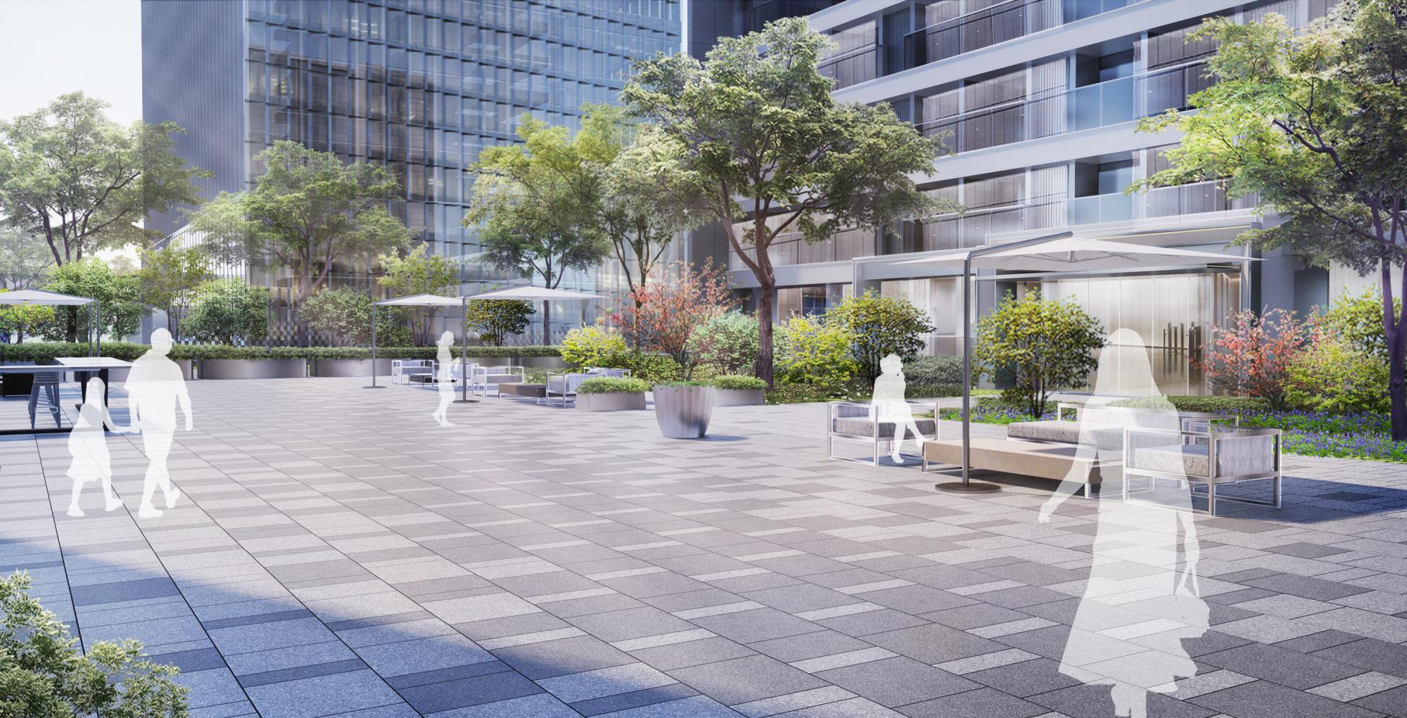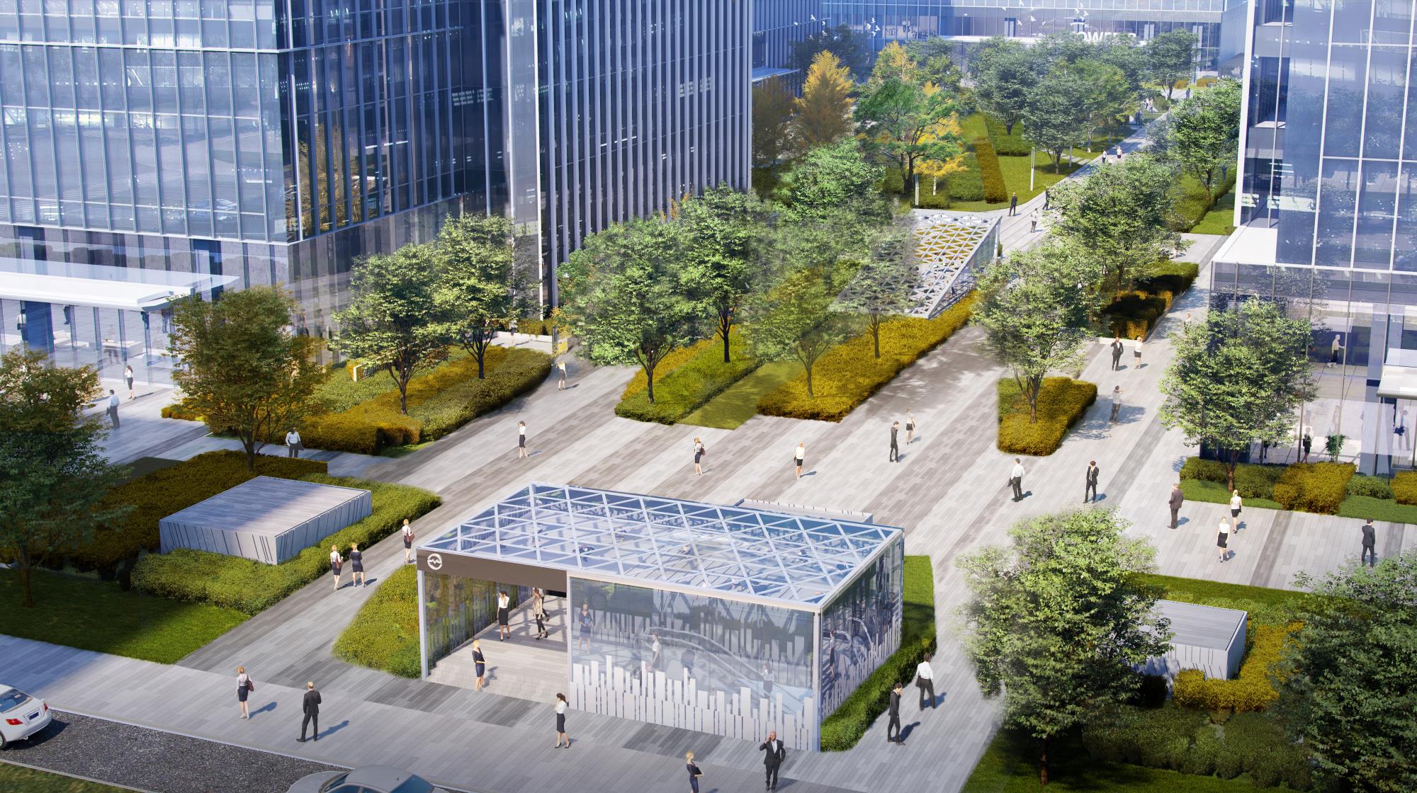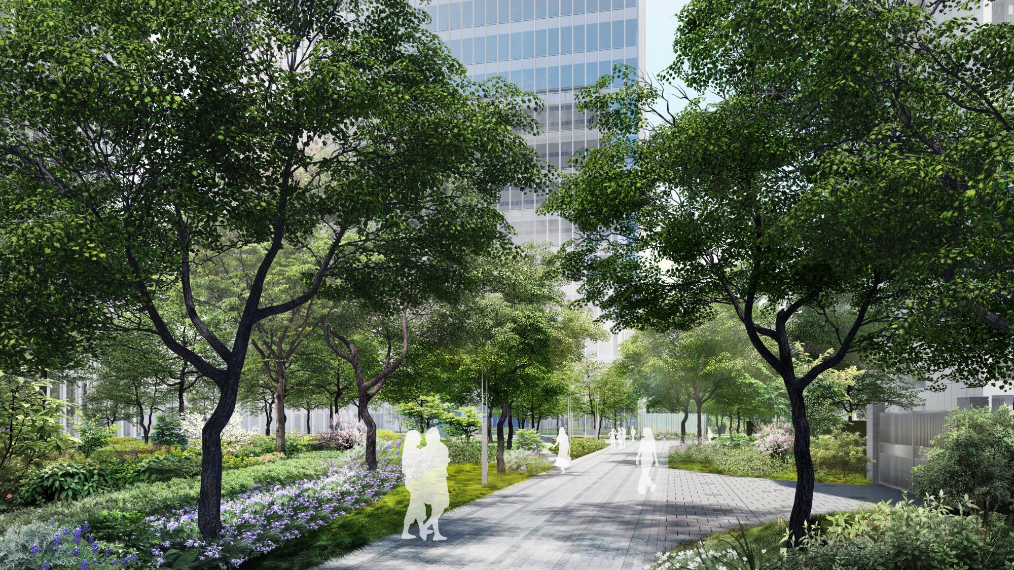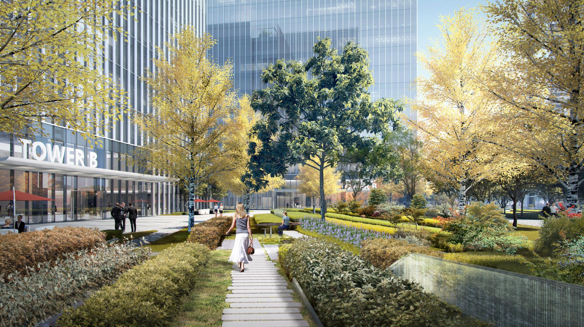 营造时间、空间皆有变化的绿化环境,以生态自然为轴,将办公、商业、住宅相联系。以绿地为轴,将办公与住宅两种不同植栽场景进行渐变式衔接,来营造更好的舒服感与过渡感。